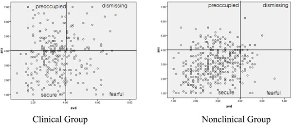 Comparison of Attachment Styles using ECR-R-18 between the Clinical and Nonclinical Groups.