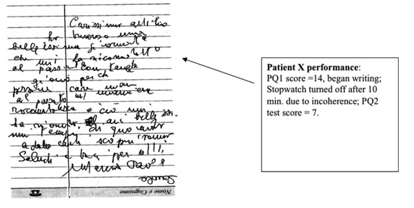 Depicts the performance of Patient X during PQ1 followed by the letter-writing test followed by PQ2. The quality of handwriting, coherence and comprehension is taken into account before deciding to terminate the writing session.