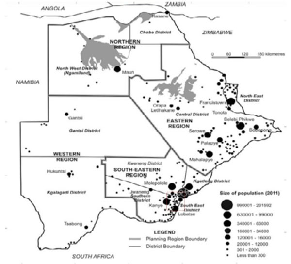Fig. (5) Distribution of settlements by planning regions. The population is concentrated on the eastern side of botswana mainly because of the reliable rainfall, fertile soils and economic opportunities. Source: 2011 Population and housing census analytical report.