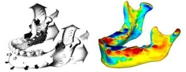 Fig. (6) Study growth map (right) shown to be in conformity to similar maps found in literature [4] (Left). The arrows contained in the literature sample indicate relative growth direction and magnitude using the relative size and direction of the arrows. The colour map of the growth map image is the same as in figures 4 and 5. As seen, our growth visualization shows inward growth near the symphysis (upper chin) with outward growth along bottom of chin, body and ramus. Additionally, in both visualizations, the proximal side of the ramus show resorption whilst the distal side shows deposition. An interesting detail poorly captured in literature is the resorption anterior to the condyle, making the process more pronounced.Reprinted with permission from D. Enlow, R. Moyers, and W. Merow, Handbook of Facial Growth., W.B. Saunders Company, 1982. Copyright Elsevier.