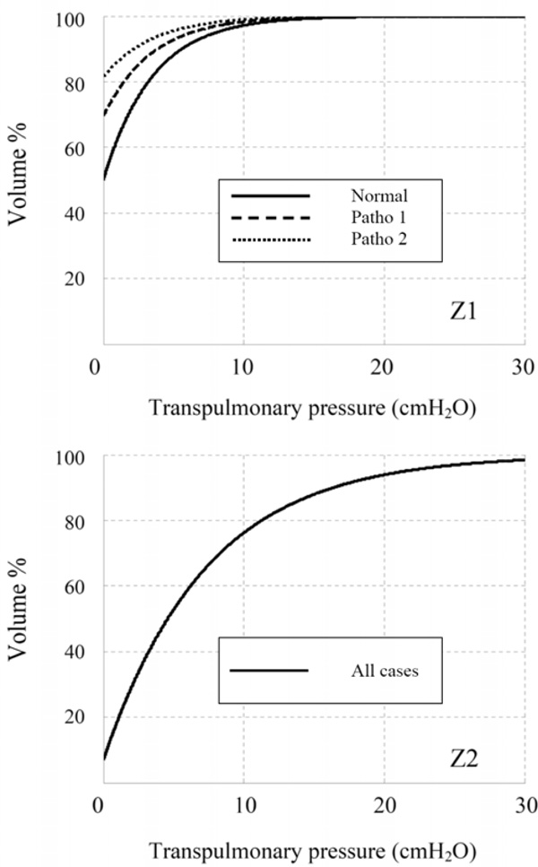 Elastic characteristics of the respiratory region of lung zones Z1 and Z2 in normal and pathological cases. The percentage volume of each zone (with respect to its maximum admissible volume) is plotted against transpulmonary pressure.