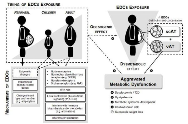 Schematic representation of the proposed mechanisms for the obesogenic and dysmetabolic effects of endocrine disrupting chemicals (EDCs), depending on timing of exposure. HPA, hypothalamic-pituitary-adrenal; T2D, type 2 diabetes; scAT, subcutaneous adipose tissue; vAT, visceral adipose tissue.