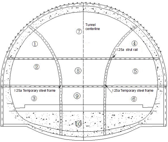 Construction drawing for two side-wall pilot tunneling method.