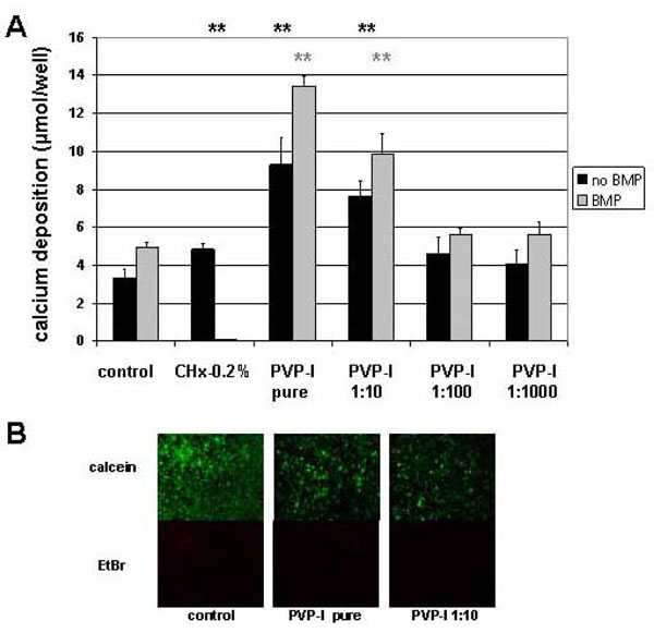 Fig. (2) Long-term effect of PVP-I treatment on preosteoblastic cells. Preosteoblastic cells were exposed to different concentrations of PVP-I on day 2 after seeding and evaluated 4 weeks later. (A) Alizarin-red staining method was used to determine mineral deposition. Dilutions of PVP-I of 1:100 and higher had no effect on the calcium deposition into the extracellular matrix. Exposure to undiluted or 1:10 diluted solutions of PVP-I, however, increased mineral deposition compared to the control untreated or respective BMP treated sample significantly (**) (**). (B) Live/dead staining revealed the presence of a majority of calcein stained living cells and a minority of EtBr stained dead cells in control samples. Although to a much lower extend living cells were also detected in samples treated with pure PVP-I or 1:10 dilutions. This minor fraction of surviving cells could account for the extended mineral deposition detected in the respective samples.