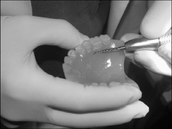 12 mm x 3 mm in depth depression is made in the denture’s external surface with a carbide bur.