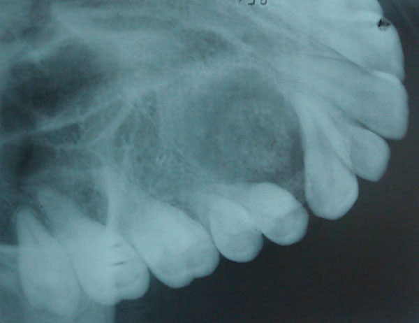 Occlusal radiograph showing target like lesion between the roots of the canine and first premolar.