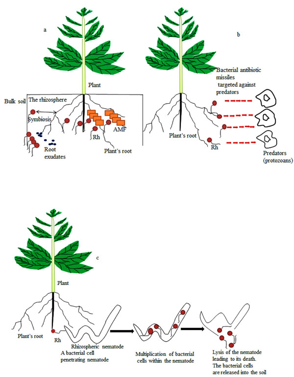 Natural interactions in the rhizosphere. (a) symbiotic interactions between plant’s root and Rh/AMF (b) amensalistic interaction between antibiotic-producing rhizobacteria and protozoans (c) parasitic interaction between the bacterium Pasteuria penetrans and root-knots nematode in the rhizosphere. Rh stands for rhizobacteria and AMF stands for arbuscular mycorrhizal fungi.