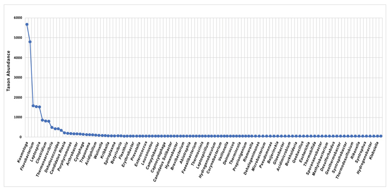 Rank abundance curve showing the taxonomic abundances and species richness of microbial community in the granular samples taken from the UASB reactor based on data generated for 16S metagenomics sequencing; ordered from the most to the least abundant.