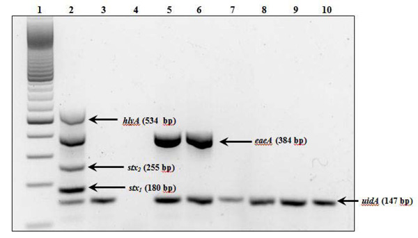 Fig. (1) Detection of virulence and housekeeping genes in E. coli isolates by multiplex PCR. Lanes: 1, 100-base pair DNA ladder; 2, positive