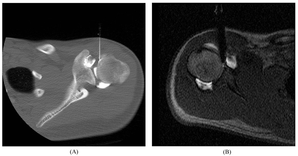 Arthrogram procedure. Anterior approach of needle for image-guided glenohumeral joint injection of contrast material using (