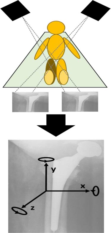 Radiostereometric analysis of the cementless femoral stem. Schematic drawing of radiographic examination of the operated hip with simultaneous exposure of two X-ray units. UmRSA calibration cage with X-ray plates under the examination table. Postoperative radiograph of a prosthesis with RSA tantalum markers on the implant and surrounding bone, coordinate system for RSA analysis.
