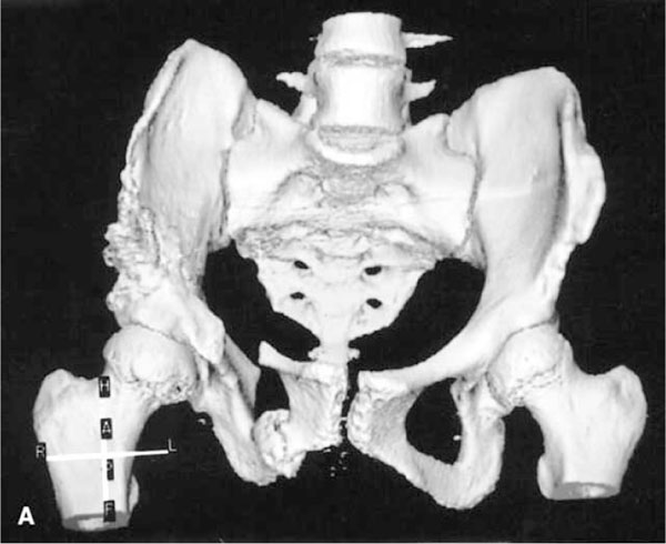 Fig. (2) A post-Steel osteotomy anterior view 3D-CT. The osteotomies of the superior pubic and ischial rami and from the ASIS to the sciatic notch are depicted. The bone graft has been removed from the superior wing of the ilium and repositioned to stabilize the acetabular fragment. Reproduced with permission from Frick S, Kim S, Wenger D; “Pre- and Postoperative Three-Dimensional Computed Tomography Analysis of Triple Innominate Osteotomy for Hip Dysplasia”, Journal of Pediatric Orthopaedics, Vol. 20, Issue 1, pp.116-23.