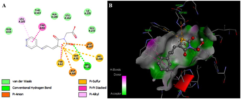 The ligand-protein interactions of compound 2a with the active site of α-amylase generated by using Discovery Studio 4.0. The (A) shows the two-dimensional interaction patterns. The legend inset represents the type of interaction between the ligand atoms and the amino acid residues of the protein. The (B) show the three-dimensional docking of the compound in the binding pocket. Dashed lines indicate the interactions between the ligand and the amino acids of the receptor.
