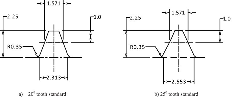 Basic rack profile for 20° and 25° involute gear tooth standards.