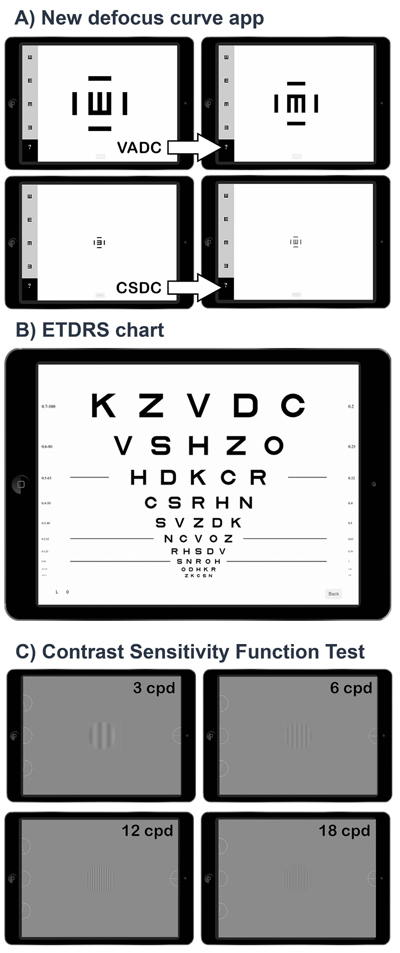 ) Test for measuring Visual Acuity Defocus Curves (VADC) and Contrast Sensitivity Defocus Curve (CSDC).