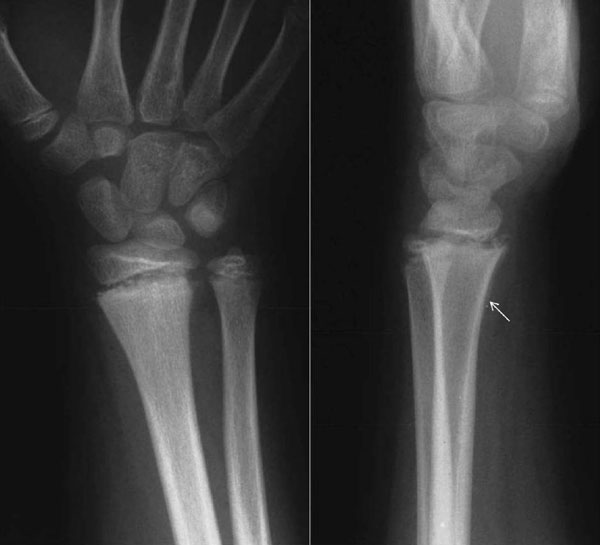 A 10-year-old boy forced his wrist into full extension while playing football. Clinical examination was indicative of a physeal fracture of the distal radius. The radiographs were negative. He was treated with a splint. Radiographs 5 weeks post-injury indicated a Salter-Harris type II lesion. The findings included widening of the distal radial physis on both views, widening between the palmar metaphyseal flake fragment and the metaphysis on the lateral view, and periosteal reaction on the palmar aspect of the radius (arrow).