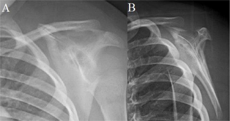 Initial radiographs. A radiolucent lesion with motheaten borders is seen on AP (