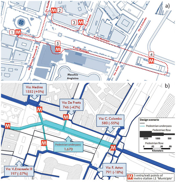 ) the main simulated pedestrian flow relative to the best design scenario implemented.